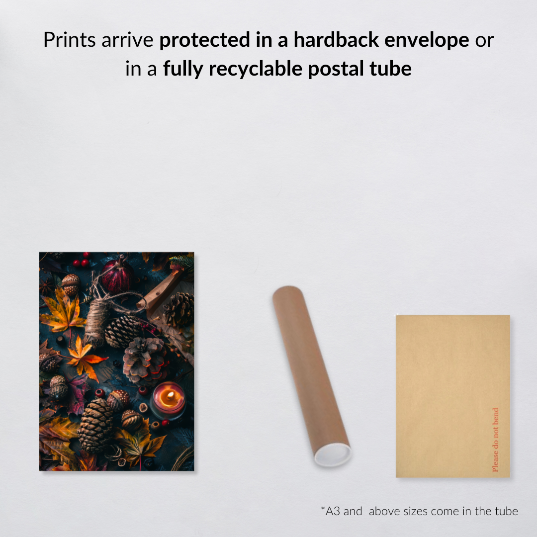 Candles flicker, pinecones gather, leaves fall — autumn lays its offerings on the table of the year. This richly layered print feels like a seasonal altar, capturing the textures, colours, and quiet rituals of harvest. Each detail is a reminder that autumn is not just a season, but a ceremony of letting go, gathering in, and finding beauty in change.