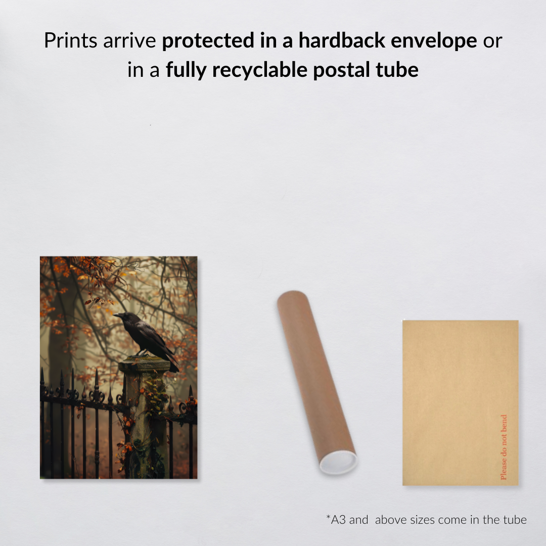 Perched on the wrought iron gate, the crow keeps its silent watch. A messenger between worlds, a guardian of thresholds, a creature of mystery and omen. Set against an autumn woodland, this print evokes the quiet magic of liminal places — where endings meet beginnings and the unseen world brushes close.