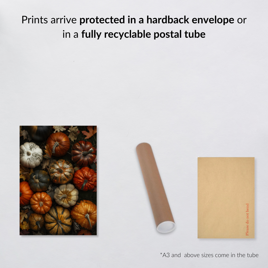 The pumpkin patch has always been a place of story — lanterns carved to ward off wandering spirits, feasts prepared for harvest’s end, and symbols of abundance glowing against the fading year. This print captures that magic in rich detail: an array of pumpkins in every hue, nestled among fallen leaves like offerings to the season itself.