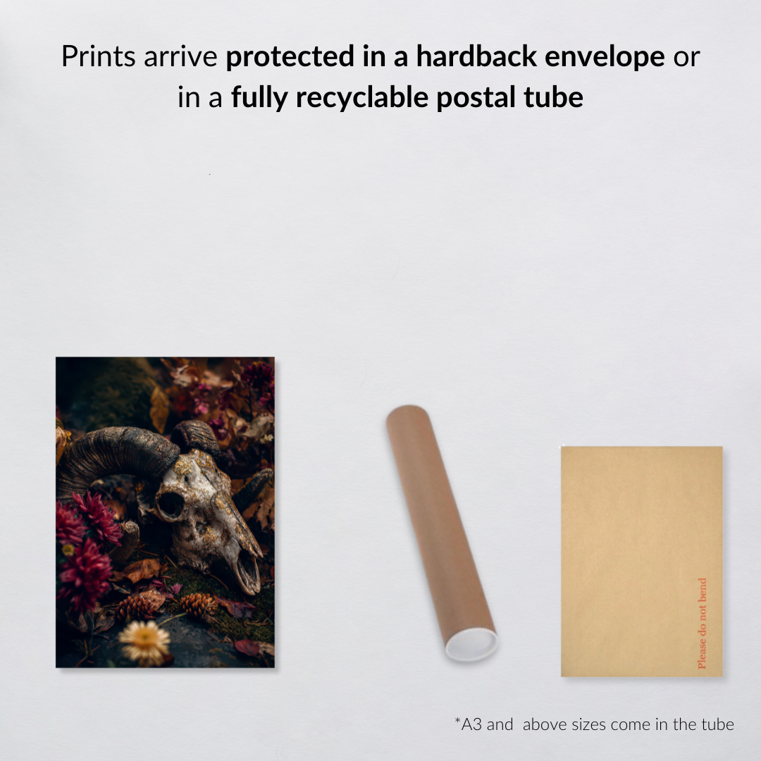 This ram skull print is a call to honour the cycles — death, decay, and renewal — and to embrace the power found in shadow.