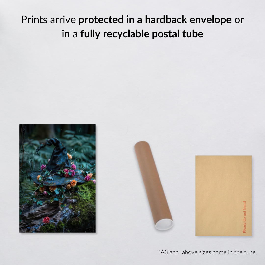 Set upon moss and ivy, crowned with roses, the witch’s hat waits — a symbol of power, wisdom, and the unseen. In folklore, the hat is more than attire: it is a crown of sovereignty, a marker of magic, a reminder that those who walk with the wild carry their own authority. This print captures that essence beautifully — moody, floral, and alive with the whisper of enchantment.